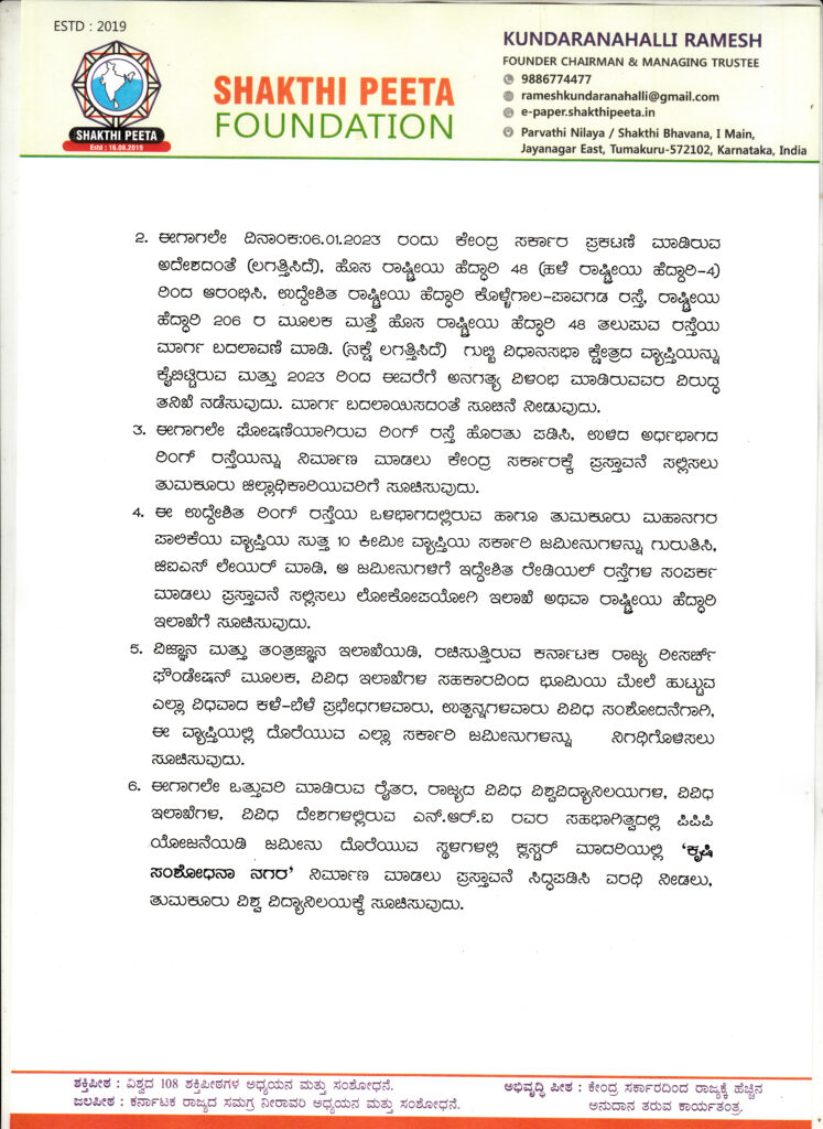 ಬೆಂಗಳೂರು ಐಟಿ-ಬಿಟಿ ಹಬ್’ ಆದರೇ ‘ತುಮಕೂರು ಕೃಷಿ ಹಬ್’ ಆಗಲಿ ಎಂಬುದು ನನ್ನ ಪರಿಕಲ್ಪನೆ. ಕೇಂದ್ರ ಸರ್ಕಾರದ ಸಚಿವರಾದ ಶ್ರೀ ಪಿಯೂಷ್ ಗೋಯಲ್ ರವರು, ತುಮಕೂರು ಬಳಿ ಸಿಲಿಕಾನ್ ವ್ಯಾಲಿ’ ಮಾದರಿಯಲ್ಲಿ ವಿನೂತನ ಯೋಜನೆ ಅನುಷ್ಠಾನಕ್ಕೆ ತರಲು ಪ್ರಸ್ತಾವನೆ ಸಲ್ಲಿಸಲು ಕೈಗಾರಿಕಾ ಸಚಿವರಾದ ಶ್ರೀ ಎಂ.ಬಿ.ಪಾಟೀಲ್ ರವರಿಗೆ ಸೂಚಿಸಿದ್ದರು.