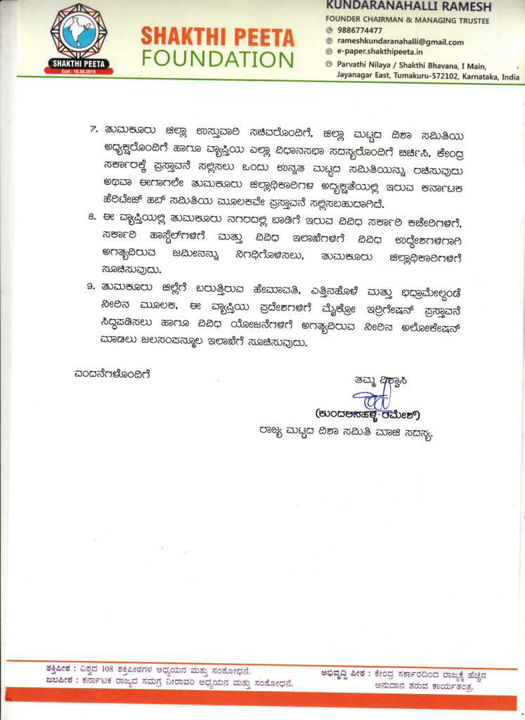 ತುಮಕೂರು ಲೋಕಸಭಾ ಸದಸ್ಯರು ಹಾಗೂ ಕೇಂದ್ರ ಜಲಶಕ್ತಿ ಮತ್ತು ರೈಲ್ವೆ ರಾಜ್ಯ ಸಚಿವರಾದ ಶ್ರೀ ವಿ.ಸೋಮಣ್ಣನವರು, ಕೊರಟಗೆರೆ ಶಾಸಕರು ಹಾಗೂ ತುಮಕೂರು ಜಿಲ್ಲಾ ಉಸ್ತುವಾರಿ ಸಚಿವರಾದ ಶ್ರೀ,ಡಾ.ಜಿ.ಪರಮೇಶ್ವರ್‍ರವರು, ತುಮಕೂರು ನಗರದ ಶಾಸಕರಾದ ಶ್ರೀ ಜಿ.ಬಿ.ಜ್ಯೋತಿಗಣೇಶ್‍ರವರು, ಈ ವ್ಯಾಪ್ತಿಯ ಶಾಸಕರುಗಳಾದ ದೆಹಲಿ ವಿಶೇಷ ಪ್ರತಿನಿಧಿ ಮತ್ತು ಶಿರಾ ವಿಧಾನಸಭಾ ಕ್ಷೇತ್ರದ ಶಾಸಕರಾದ ಶ್ರೀ ಟಿ.ಬಿ.ಜಯಚಂದ್ರರವರು, ಮಧುಗಿರಿ ಶಾಸಕರು ಮತ್ತು ಮಾಜಿ ಸಚಿವರಾದ ಶ್ರೀ ಕೆ.ಎನ್.ರಾಜಣ್ಣನವರು, ಗುಬ್ಬಿ ವಿಧಾನ ಸಭಾ ಸದಸ್ಯರು ಹಾಗೂ ಮಾಜಿ ಸಚಿವರಾದ ಶ್ರೀ ಎಸ್.ಆರ್. ಶ್ರೀನಿವಾಸ್ ರವರು ಮತ್ತು ತುಮಕೂರು ಗ್ರಾಮಾಂತರ ಶಾಸಕರಾದ ಶ್ರೀ ಬಿ. ಸುರೇಶ್ ಗೌಡರವರು ಒಗ್ಗಟ್ಟಾಗಿ ಶ್ರಮಿಸಿದರೆ, ಈ ಎಲ್ಲಾ ಯೋಜನೆಗಳು ಜಾರಿಯಾಗುವುದರಲ್ಲಿ ಸಂಶಯವಿಲ್ಲ.