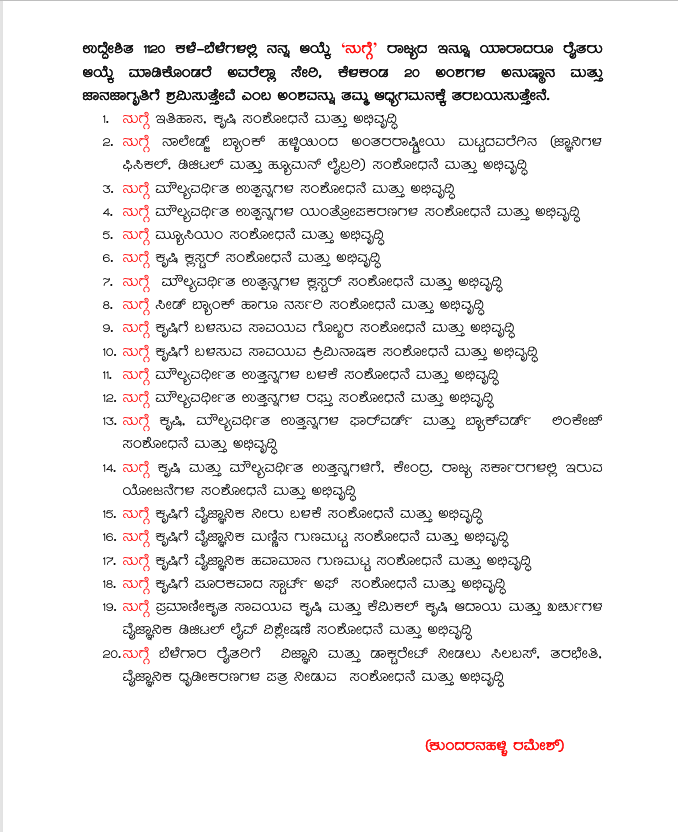 ಕೃಷಿ ಆಶ್ರಮಗಳ ಹರಿಕಾರ ಡಾ.ನಾಗಭೂಷಣ್ ರವರು ಮತ್ತು ಡಾ.ಜಗನ್ನಾಥ್ ರವರೊಂದಿಗೆ ಚರ್ಚಿಸಿ, ಒಂದು ನಿರ್ಧಿಷ್ಟ ಬೆಳೆ ಆಯ್ಕೆ ಮಾಡಿಕೊಂಡು, ಈ ಪತ್ರದಲ್ಲಿ ಇರುವ ‘ರೆಡ್ ಕಲರ್’ ಪದಗಳನ್ನು ನಿಮ್ಮ ಪತ್ರಕ್ಕೆ ಪೂರಕವಾಗಿ, ಮಾರ್ಪಾಡು ಮಾಡಿ, ಕೃಷಿ ಸಚಿವರಿಗೆ ರಿಜಿಸ್ಟರ್ ಪತ್ರ ಬರೆಯಿರಿ ಅಥವಾ ಇ ಮೇಲ್ ಮಾಡಿ, ದಾಖಲೆಯೊಂದಿಗೆ ನಮಗೂ ಒಂದು ನಕಲು ಕಳುಹಿಸಲು ಈ ಮೂಲಕ ಕೋರಿದೆ.